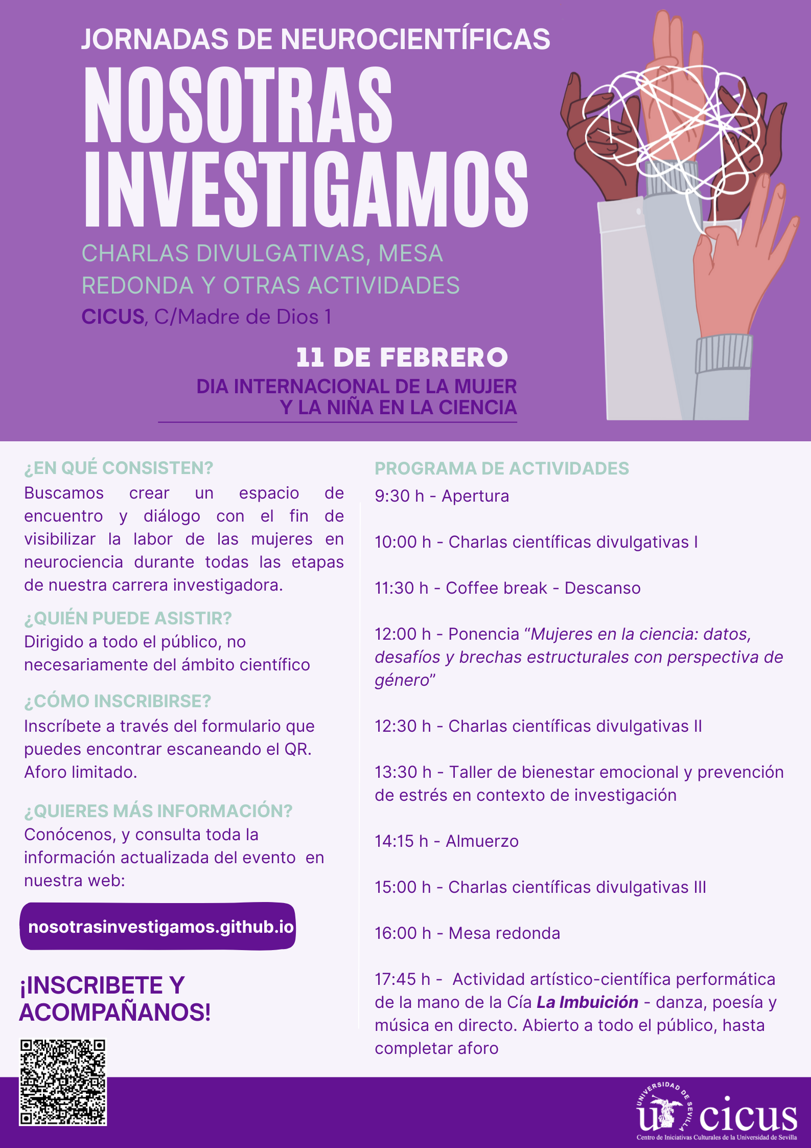 Las jornadas combinan charlas divulgativas en neurociencia, una ponencia con perspectiva de género, un taller de salud mental en investigación y entorno universitario, una mesa redonda y una actividad artístico-científica orientada a potenciar la reflexión, la divulgación y el diálogo entre ciencia y sociedad.